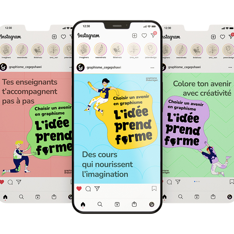 Ce projet consiste en la réalisation d’une campagne publicitaire destinée aux réseaux sociaux, principalement Instagram, dans le but de promouvoir et recruter des étudiants en graphisme au Cégep de Shawinigan.